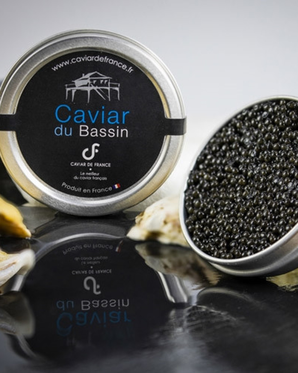 CAVIAR DU BASSIN : un caviar préparé d'une manière traditionelle, peu affiné. ses grains expriment des saveurs légères et équilibrées subtilement iodées